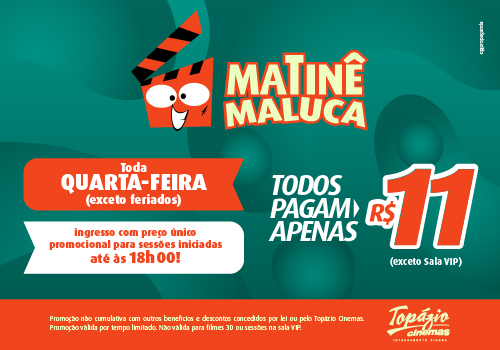 Toda quarta-feira (exceto feriados e sessões de pré-estreia), para sessões iniciadas até às 18h00 (exceto sala VIP), o ingresso tem valor único promocional: R$ 11,00 por pessoa. A promoção Matinê Maluca não é cumulativa com outros descontos concedidos por lei ou pelo Topázio Cinemas. Esta promoção é válida para compras realizadas pela internet (site e aplicativo) ou diretamente no cinema (bilheterias e totens de autoatendimento). Promoção válida por tempo limitado.