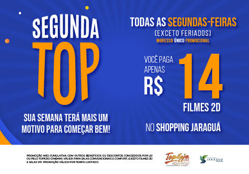 Toda segunda-feira (exceto feriados e sessões de pré-estreia) o ingresso tem valor promocional no Shopping Jaraguá: apenas R$ 14,00 por pessoa (exceto filmes 3D). A promoção Segunda Top não é cumulativa com outros descontos concedidos por lei ou pelo Topázio Cinemas. Esta promoção é válida para compras realizadas pela internet (site e aplicativo) ou diretamente no cinema (bilheterias e totens de autoatendimento). Promoção válida por tempo limitado.