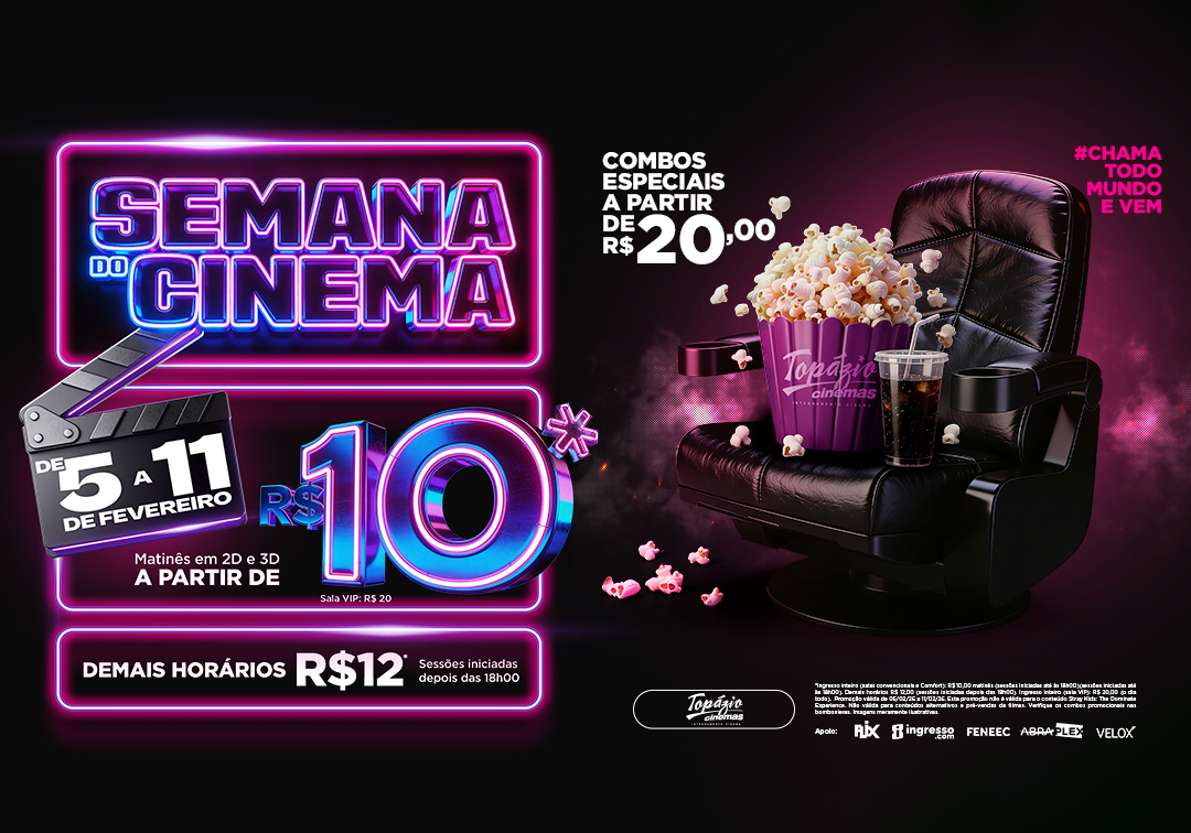 De 5 a 11 de fevereiro de 2026 acontece a 8ª edição da Semana Do Cinema em todo o Brasil! Olha só como você pode aproveitar no Topázio Cinemas: